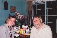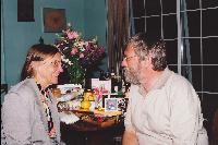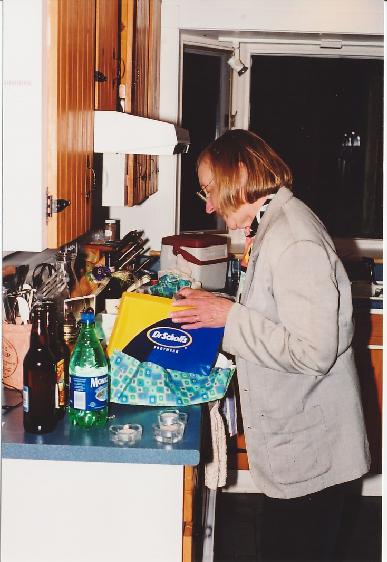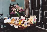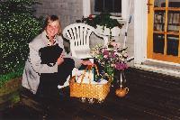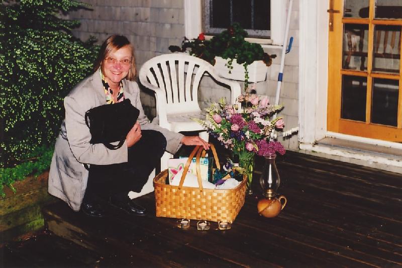 So I was upstairs sending email and stuff, and went down to turn the porch lights on about a quarter to ten, in expectation of your mother's arrival. When I looked out on the deck, I saw a light, down on the floor. then I noticed that what it was illuminating was a huge bouquet of flowers, and a bunch of other unidentfiable stuff. I knew what this must mean . . . or part of it . . . so I didn't even go outside. I waited. When the garage door went up, I opened the door and waited while Frederika pulled in.